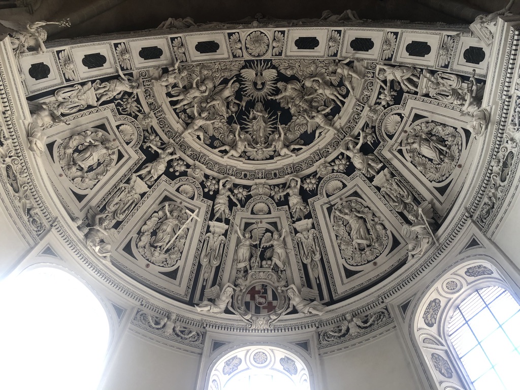 The ceiling of the western apse of the cathedral in Trier, just across the border with Germany from us, features angels waving crosses and banners and dangling their limbs all into our space. It’s lighter and more transgressive than Hansche’s work, but also a lot more crowded. The artist is supposedly Giovanni Domenico Rossi, and the usual date given is the 1660s, so exactly contemporaneous with Hansche’s career.