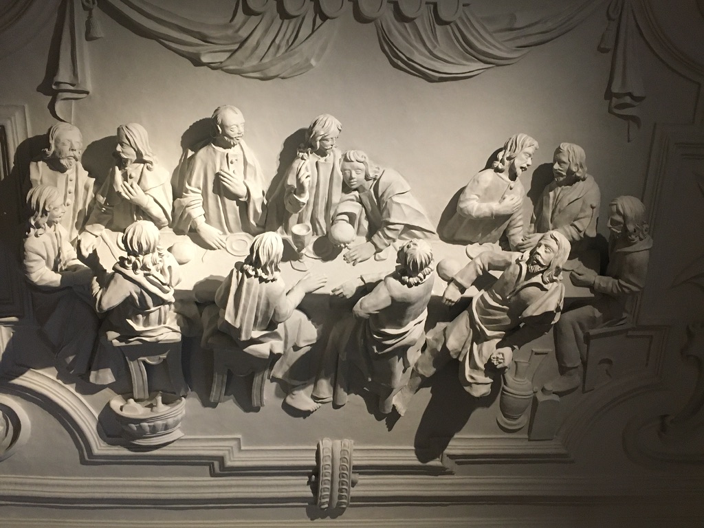 Hansche’s style of three-dimensional stucco sculpture is very unusual. Possibly the best single piece is the Last Supper from the refectory of Park Abbey near Leuven. Here six of the apostles lean out of the ceiling into our space. Jesus’ arm, and the bread which he is consecrating, are also three-dimensional. I have looked fairly hard and found nothing else quite like it.