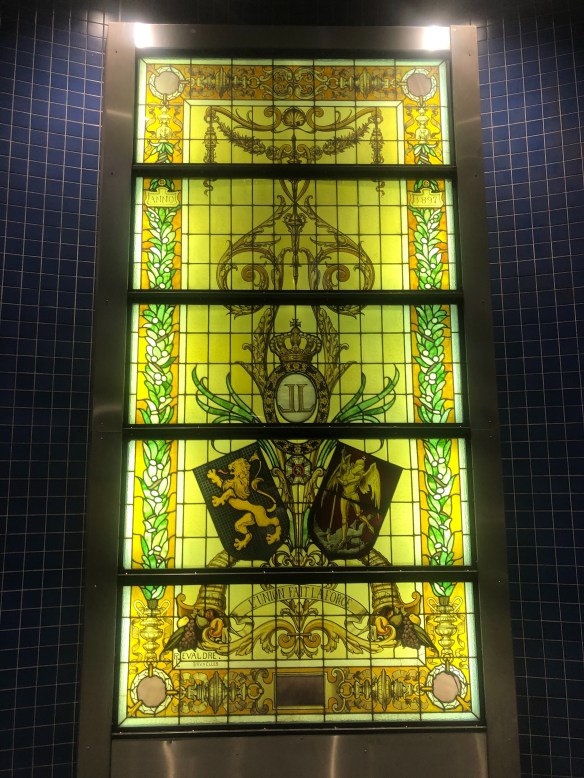 On the stairway down to Platform 1 at the Brussels Luxembourg railway station, if you look up you’ll see this 1897 Art Nouveau stained glass commemoration of (evil) King Leopold II by master glassman Raphael Evaldre. It has the arms of Belgium and of Brussels, the monogrammed L and the Belgian motto, “l’Union fait la Force” (roughly, “Unity is Strength”). You can also see Evaldre’s signature at bottom left.