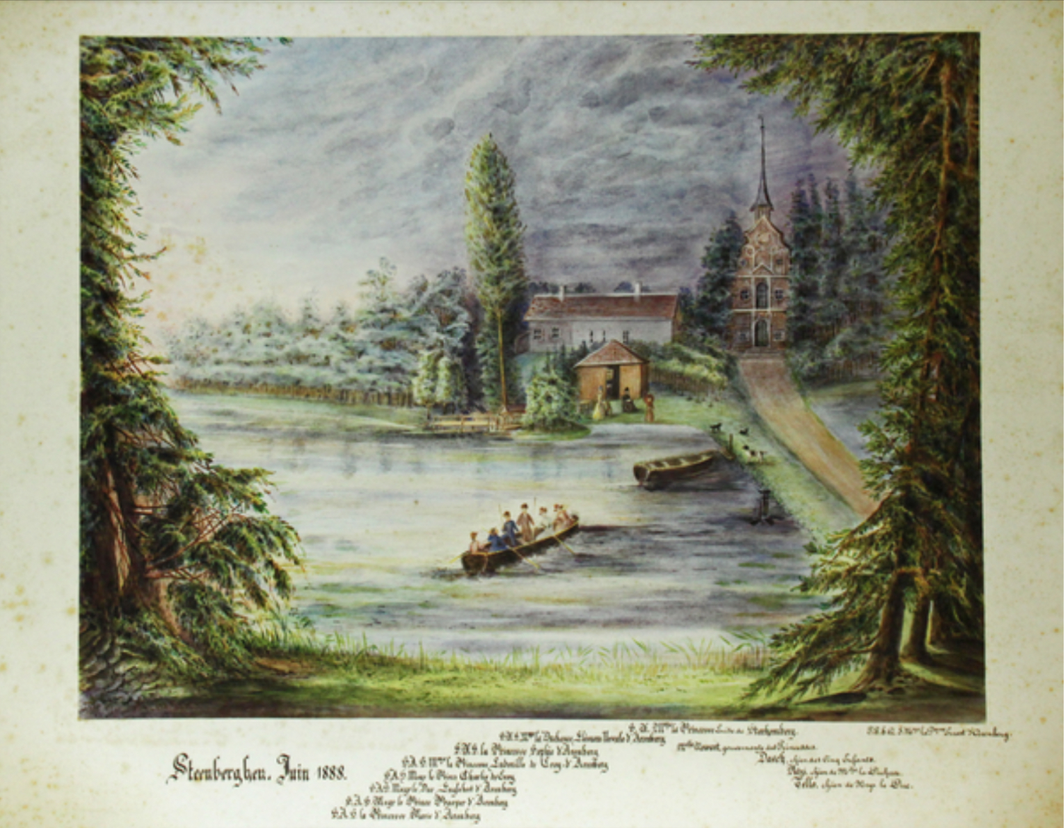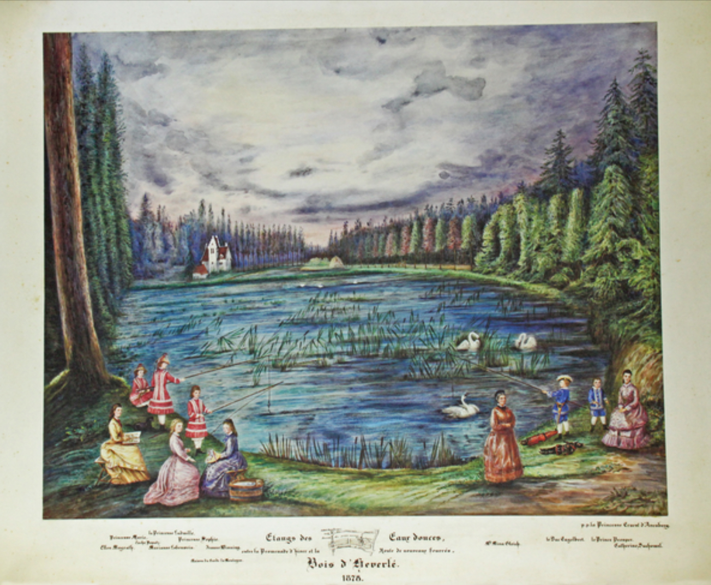 The paintings feature their daughter Éléonore (1845-1919) who married her cousin Duke Engelbert d’Arenberg (1824 – 1875) in 1868, and their five children and other relatives. The painter signs herself “Princesse Ernest d’Arenberg”, commemorating her husband who had died more than 20 years earlier.